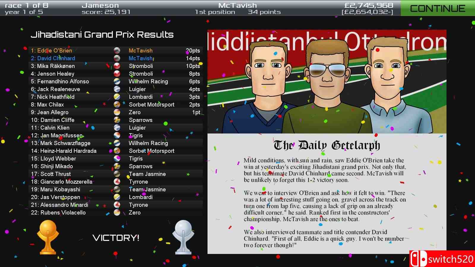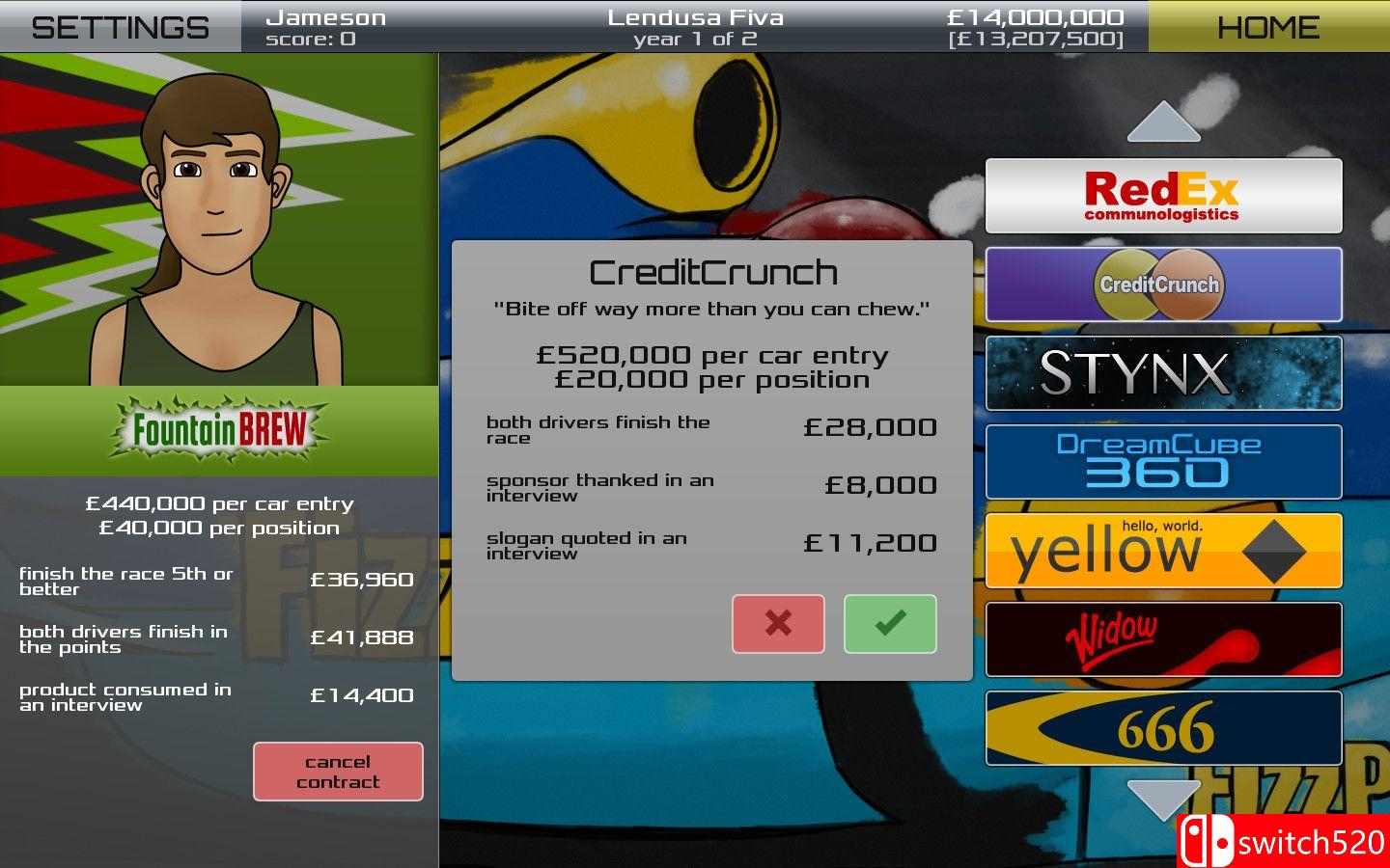 《方程式赛车XD》是一款赛车竞速类(RAC)游戏,《方程式赛车XD》是 一款将玩家置于赛车队经理角色的策略游戏。在这里,你将负责从雇佣车手、与赞助商与引擎供应商谈判合约,到做出各种重大决策,以确保车队赢得比赛并保持财政健康。作为经理,你需要向车手发布指令,让他们在赛道上奋战,为胜利或失败负责。switch520